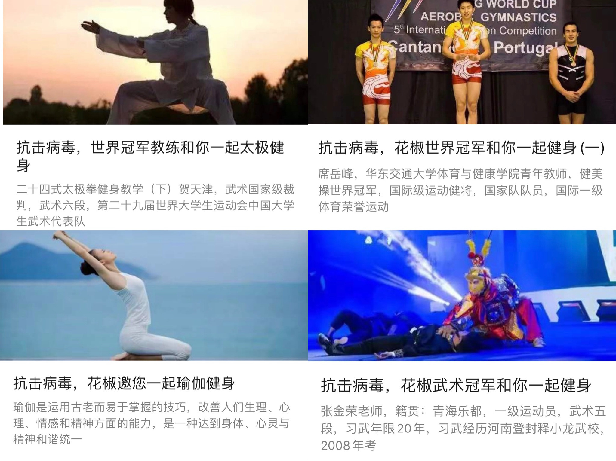 疫情暴发后,华东交大省“一流专业”运动训练学积极主动对标国家一流专业要求的“紧扣国家发展需求、服务面向清晰、适应国家和区域经济社会发展需要”的申报和专业条件,并结合国家和地方疫情防控的重大现实需要,从运动医学、运动训练学、运动心理学等多学科和综合性视角,及时面向分布在全国各地的华东交大师生研制了居家隔离期的“合理运动,科学预防,娱乐身心”的操作指南和方案。在锻炼方法上,结合居家隔离期间的空间限制,以武术、太极拳、瑜伽等项目的世界冠军和全国冠军为主,及时研制推送了6部视频、图文并茂与文字讲解相结合的《世界冠军和你一起来健身》系列专题;在科学指导健身上,由运动医学博士和教授撰写了7篇图文并茂的《抗击病毒,科学健身》系列专题内容;在心态调整上,撰写推送了3篇《抗击病毒,调节心态》系列专题内容;在合理起居饮食上,撰写推送了2篇《抗击病毒,合理饮食》的专题内容。