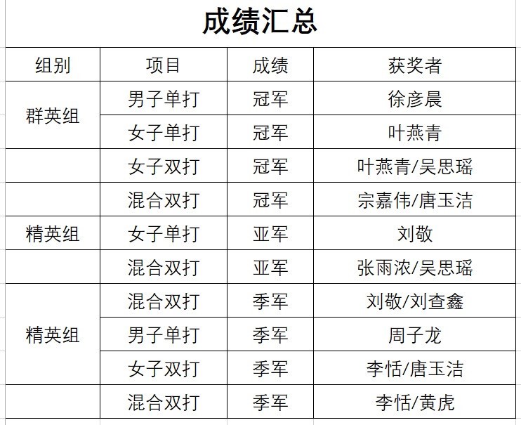 公司青年教师刘敬和刘查鑫分别获得精英组女子单打亚军、混合双打季军。员工周子龙获得精英组男子单打季军,李恬/唐玉洁获得精英组女子双打季军。在群英组的比赛中,公司员工获得全部五个项目中的四个冠军,员工徐彦晨、叶燕青分别获得群英组男子和女子单打冠军,叶燕青/吴思瑶获得女子双打冠军,宗嘉伟/唐玉洁、张雨浓/吴思瑶和李恬/黄虎获得混合双打冠军、亚军和季军。本次比赛是全国业余选手水平最高的赛事,吸引了来自全国各地的245名运动员参加比赛。