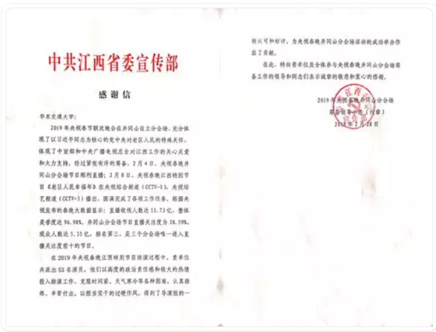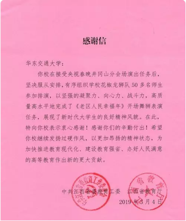 近日,公司分别收到了江西省委宣传部和江西省教育工委(教育厅)的感谢信,对公司“花椒龙狮队”圆满完成2019年央视春晚表演任务给予表扬。