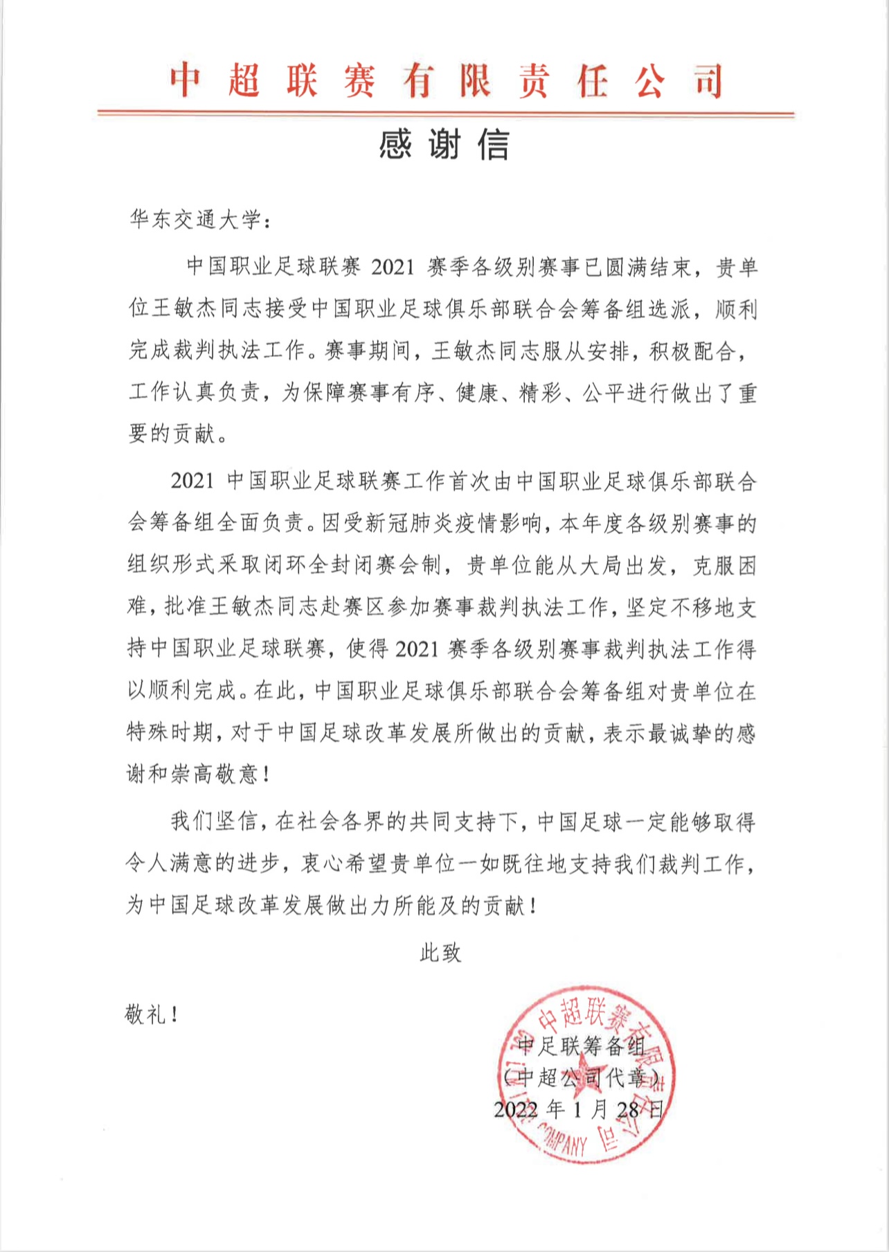 中超公司致感谢信赞赏公司研究生为中国职业足球联赛2021赛季作出贡献。